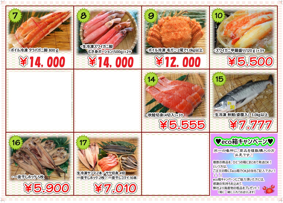 | eco箱キャンペーン 同一の場所に、商品を複数購入の方は必見!! 複数の商品を、ひとつの箱にまとめて発送OK!という方は、ご注文の際に『eco箱でOK』の旨をご記入下さい! eco箱キャンペーンにご協力頂いた方には感謝の気持ちを込めて、弊社より海産物の粗品をプレゼント!(箱に一緒に入れてお送りします) |