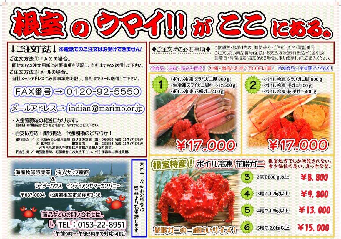 | @ | ・ボイル冷凍タラバガニ脚 1肩 800g ・生冷凍ズワイガニ脚ポーション 500g ・ボイル冷凍花咲ガニ 1尾 400g |